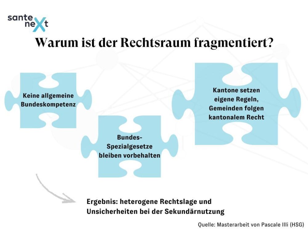 In Kollaboration zwischen der HSG und santeneXt untersucht Pascale Illi in ihrer HSG-Masterarbeit, wie die datenschutzrechtliche Einwilligung so gestaltet werden kann, dass effiziente Sekundärnutzung und Persönlichkeitsrechte zusammenfinden. Ausgangspunkt: eine stark fragmentierte Rechtslandschaft ohne spezifisches Rahmengesetz, in der heute oft die Einwilligung als «Absicherung» gegen Rechtsunsicherheit dient. «No data, no health» – aber wie mit klaren Regeln?